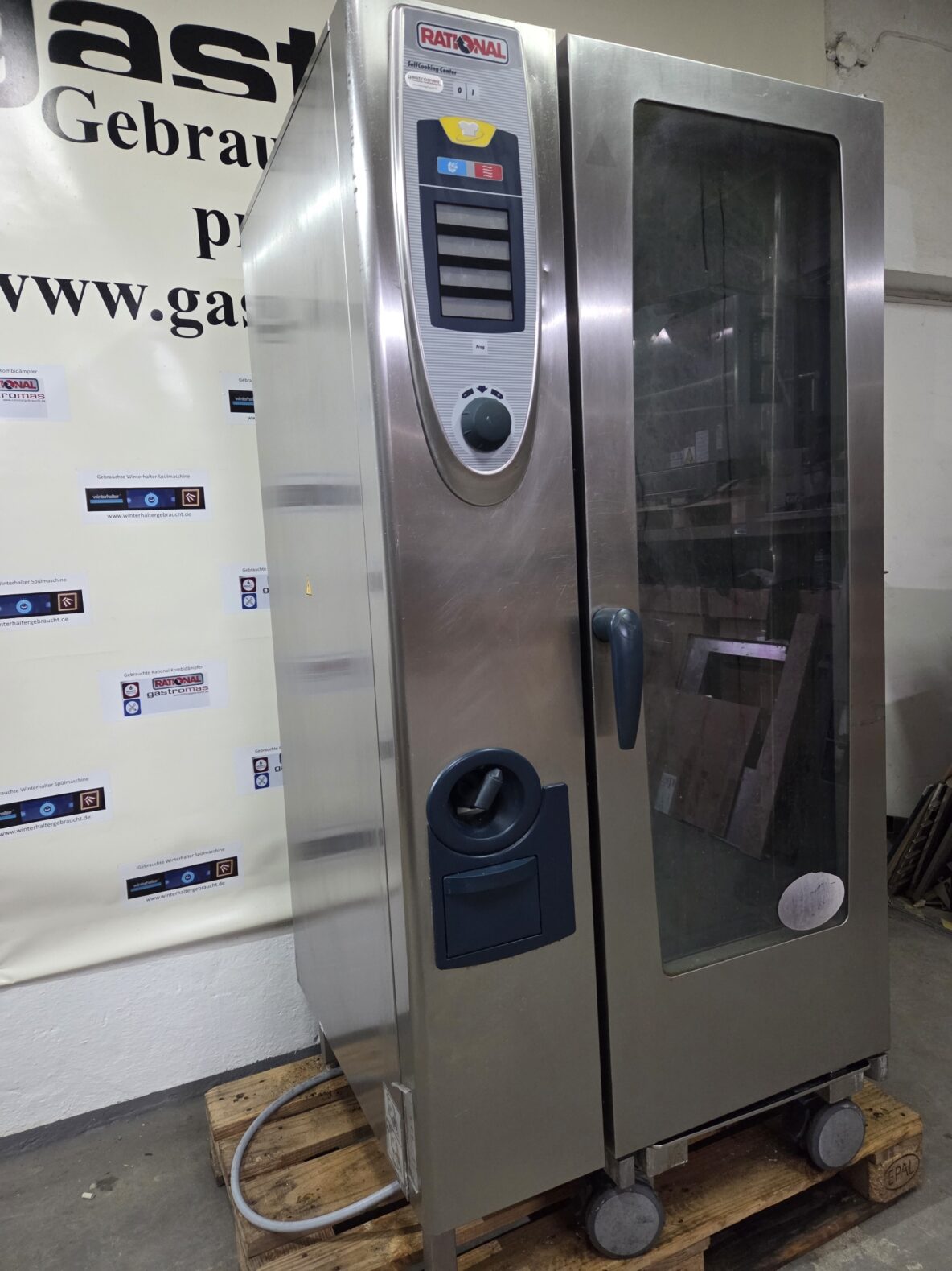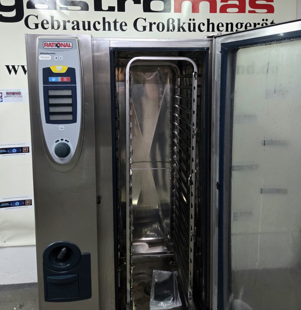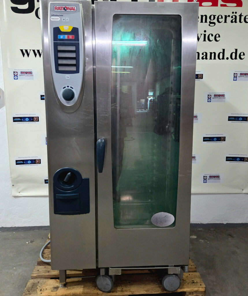 Kombidämpfer von Rational, Modell SCC201Self Cooking Center. Das Gerät verfügt über einen Kerntemperaturmesser, einem Hordengestellwagen mit 20 GN 1/1 Einschüben .